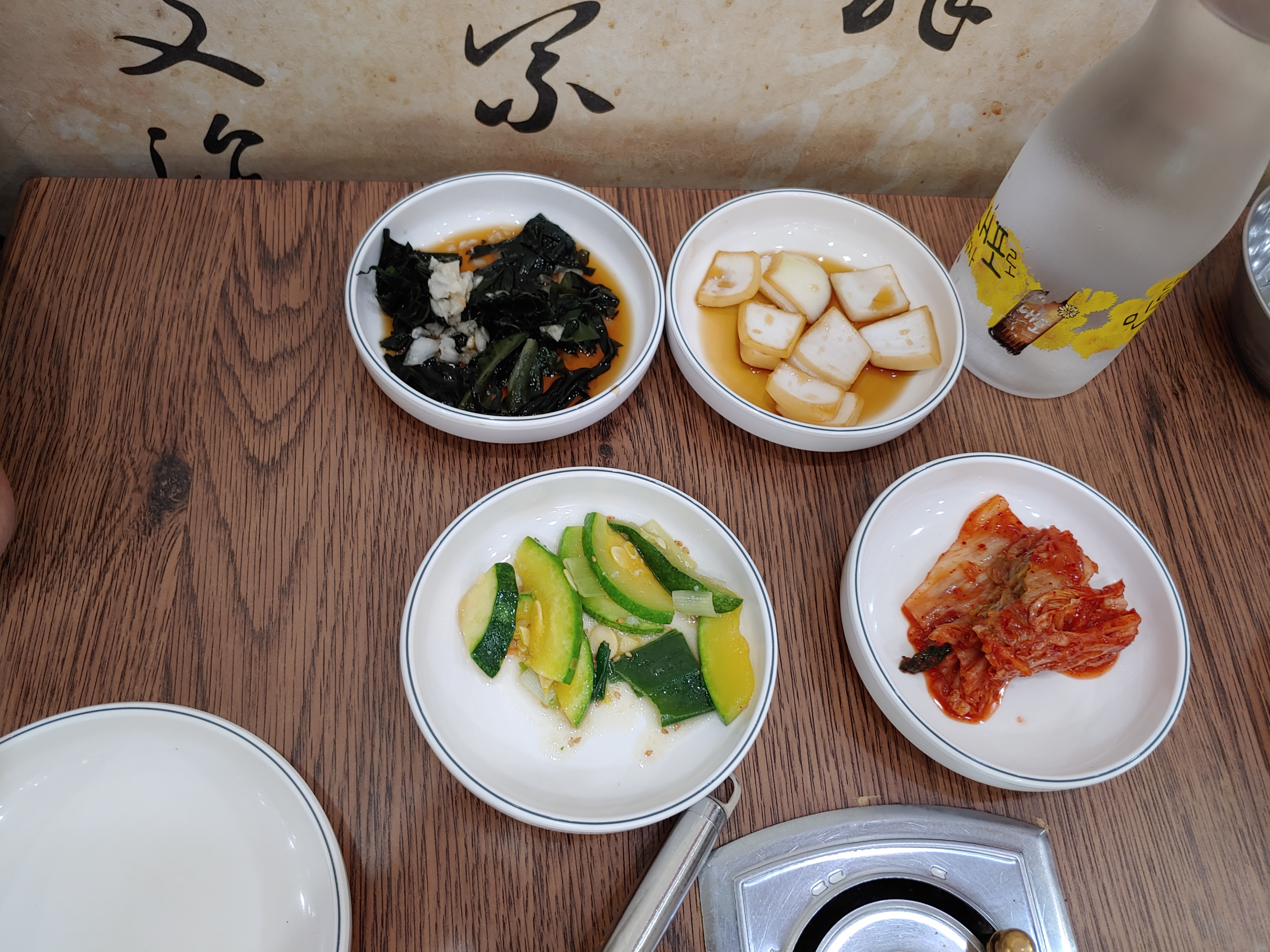 반찬은 미역무침, 양파간장, 호박볶음과 김치가 나왔어요